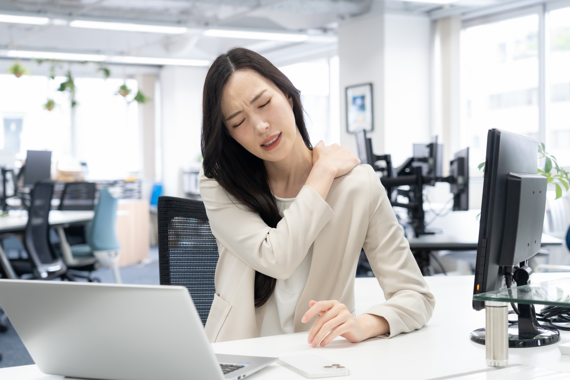さらに、この姿勢は肩が内側に入る「巻き肩」も引き起こし、猫背を悪化させ、肩こりをさらに頑固なものにしてしまいます。